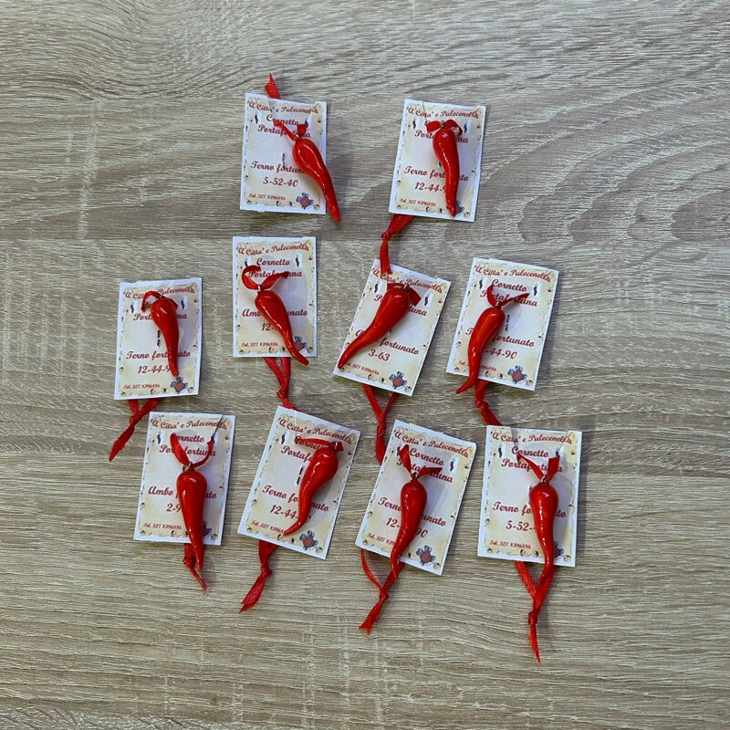 Cornetti portafortuna in terracotta, realizzati e dipinti interamente a mano, con laccetto e cartoncino con numeri fortunati, ambo, terno. In confezioni da 10, 25 o 50 pezzi. Misura circa cm. 4,5 / 5