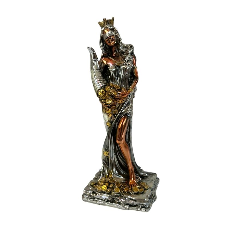 Statua della Dea Bendata realizzata in resina, dipinta a mano in Italia. Base con sotto in feltro che la rende stabile e antiscivolo. Colorazione argento con varie sfumature lucenti ed eleganti tendenti al bronzo, all'oro e simili... Misura cm 21 (vedi foto). Statuetta da esposizione e collezione, ottima idea regalo per gli amanti di queste figura. Prodotto ricco di dettagli con volto alquanto realistico. Simbolo di buon auspicio e prosperità, ideale per nuove attività o nuove case.